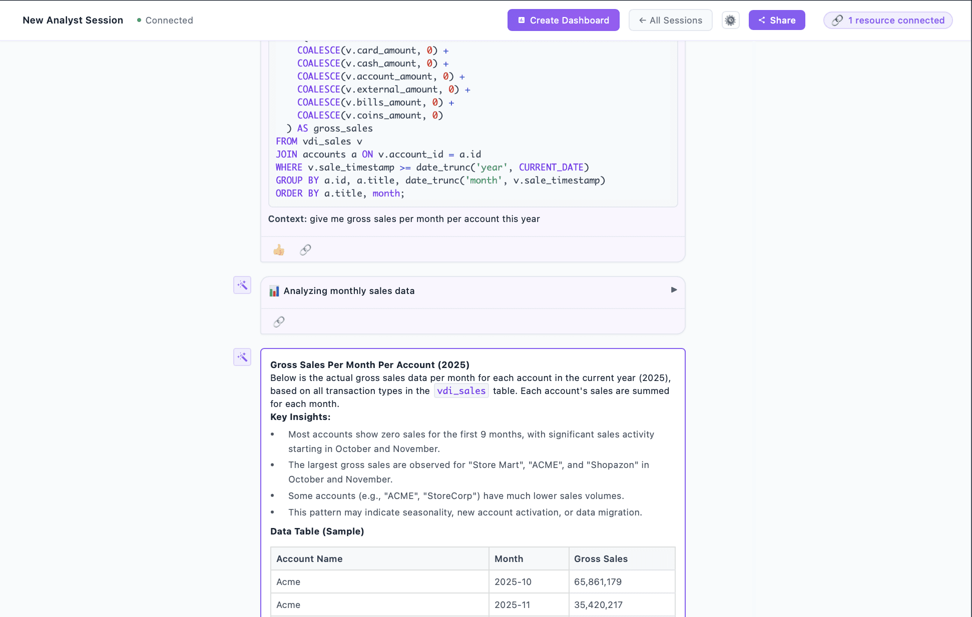 From warehouse tables to operational systems to Slack, your analyst works with your existing stack and maps the topology of your data automatically.